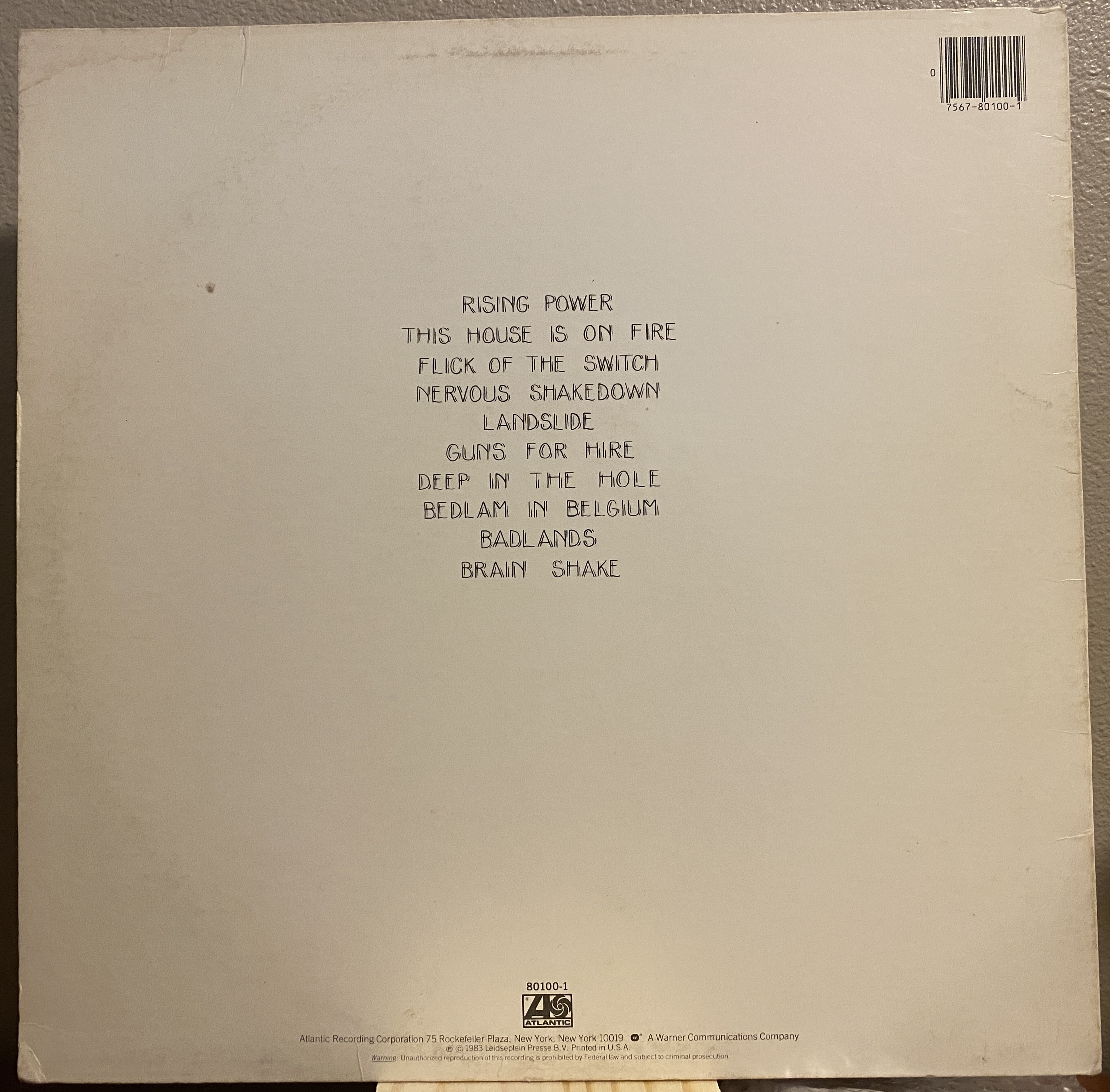Side 1 1) Rising Power 2) This House is on Fire 3) Flick of the Switch 4) Nervous Shakedown 5) Landslide Side 2 1) Guns for Hire 2) Deep in the Hole 3) Bedlam in Belgium 4) Badlands 5) Brain Shake |