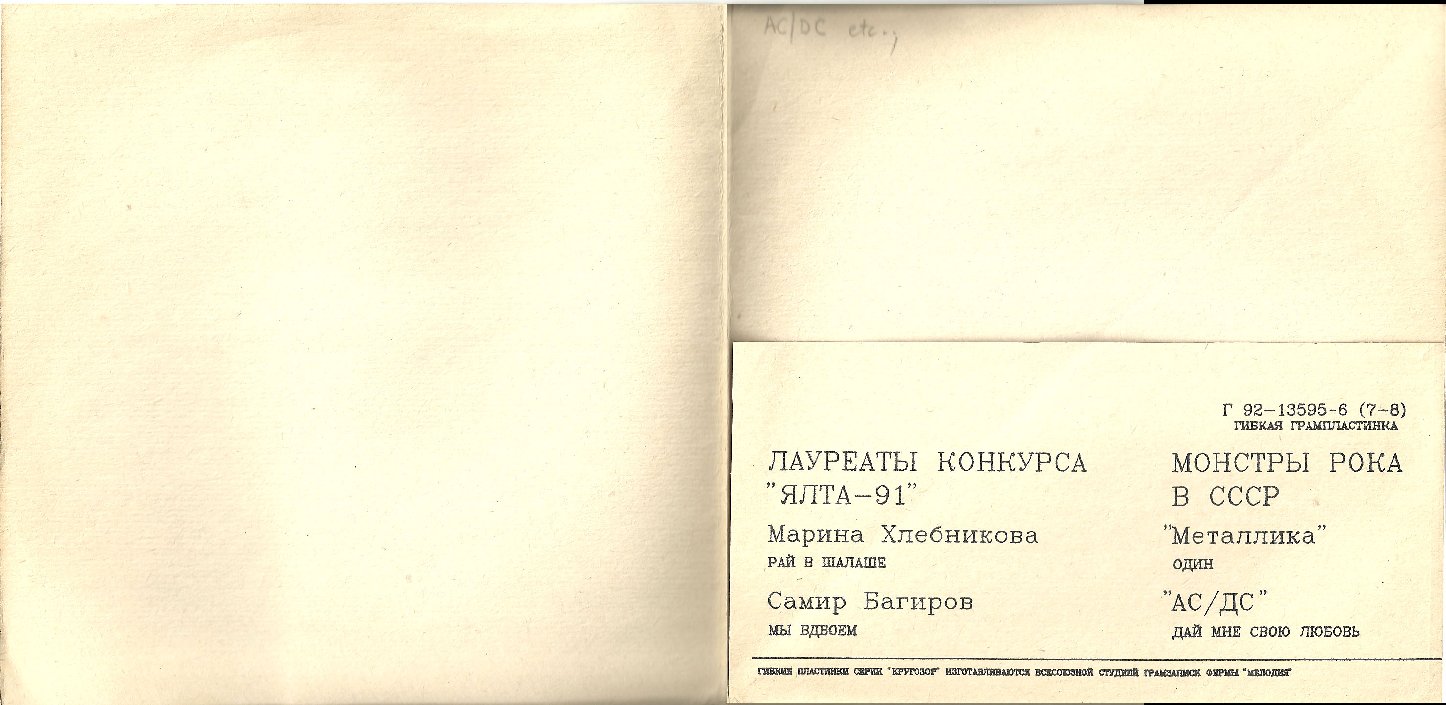 From Krugozor Sound Magazine in Russia, Dec.1991. Flexi disc is very thin, transparent and light green in color. A blue variation is also available. |