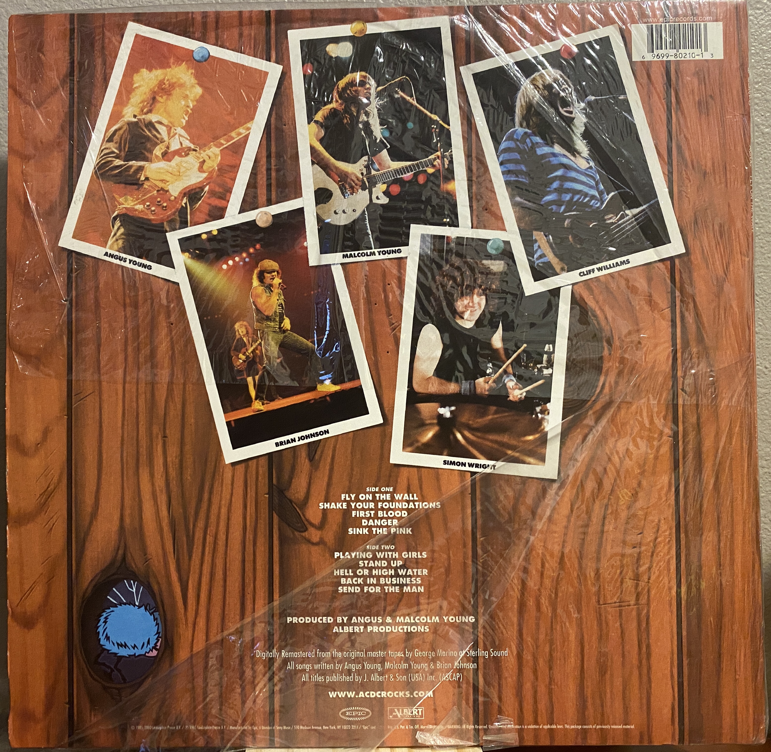 Side 1 1) Fly on the Wall 2) Shake Your Foundations 3) First Blood 4) Danger 5) Sink the Pink Side 2 1) Playing with Girls 2) Stand Up 3) Hell or High Water 4) Back in Business 5) Send for the Man |