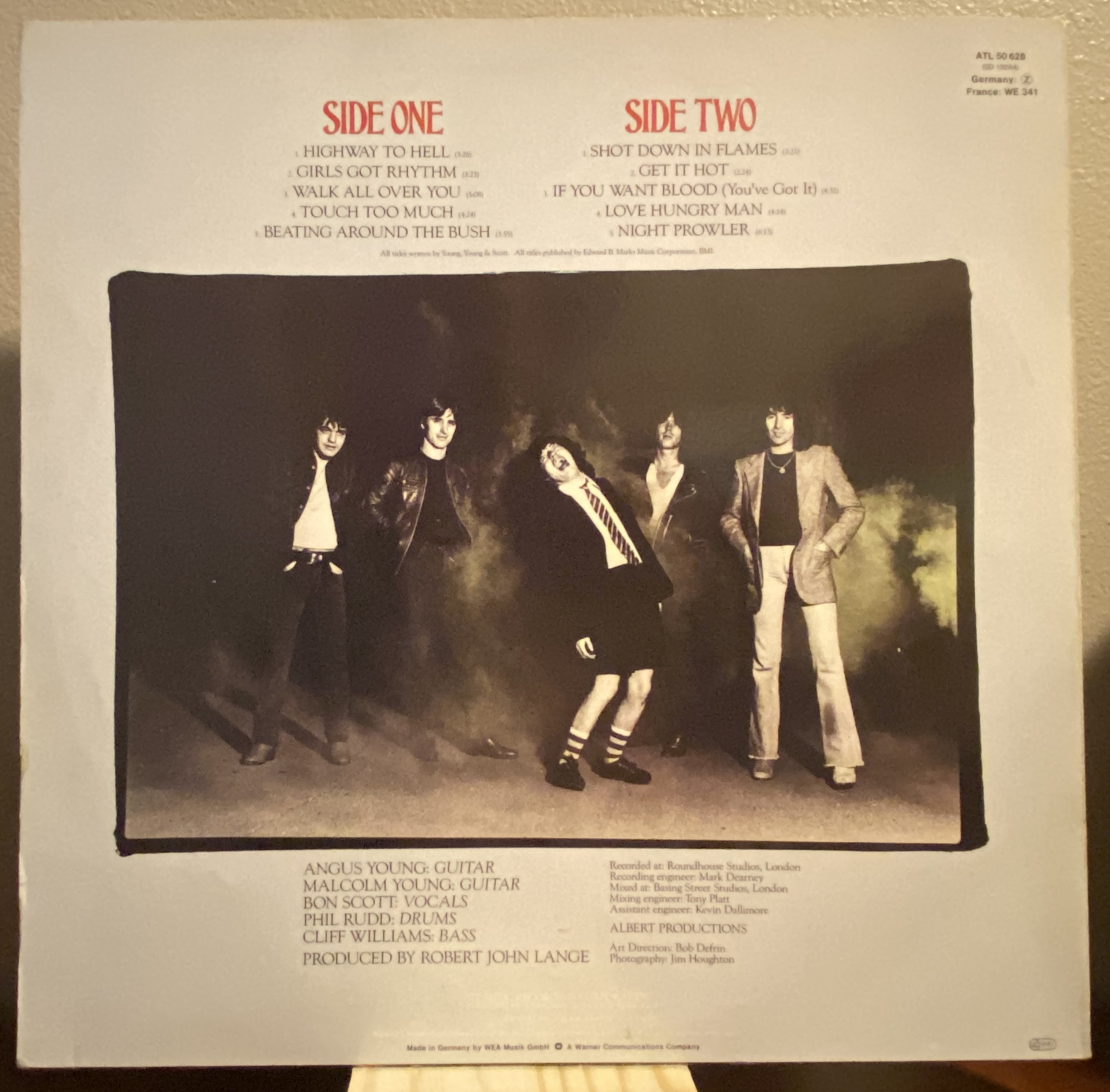 Track List Side 1 1) Highway to Hell 2) Girls Got Rhythm 3) Walk All Over You 4) Touch Too Much 5) Beating Around the Bush Side 2 1) Shot Down in Flames 2) Get It Hot 3) If You Want Blood (You've Got It) 4) Love Hungry Man 5) Night Prowler |