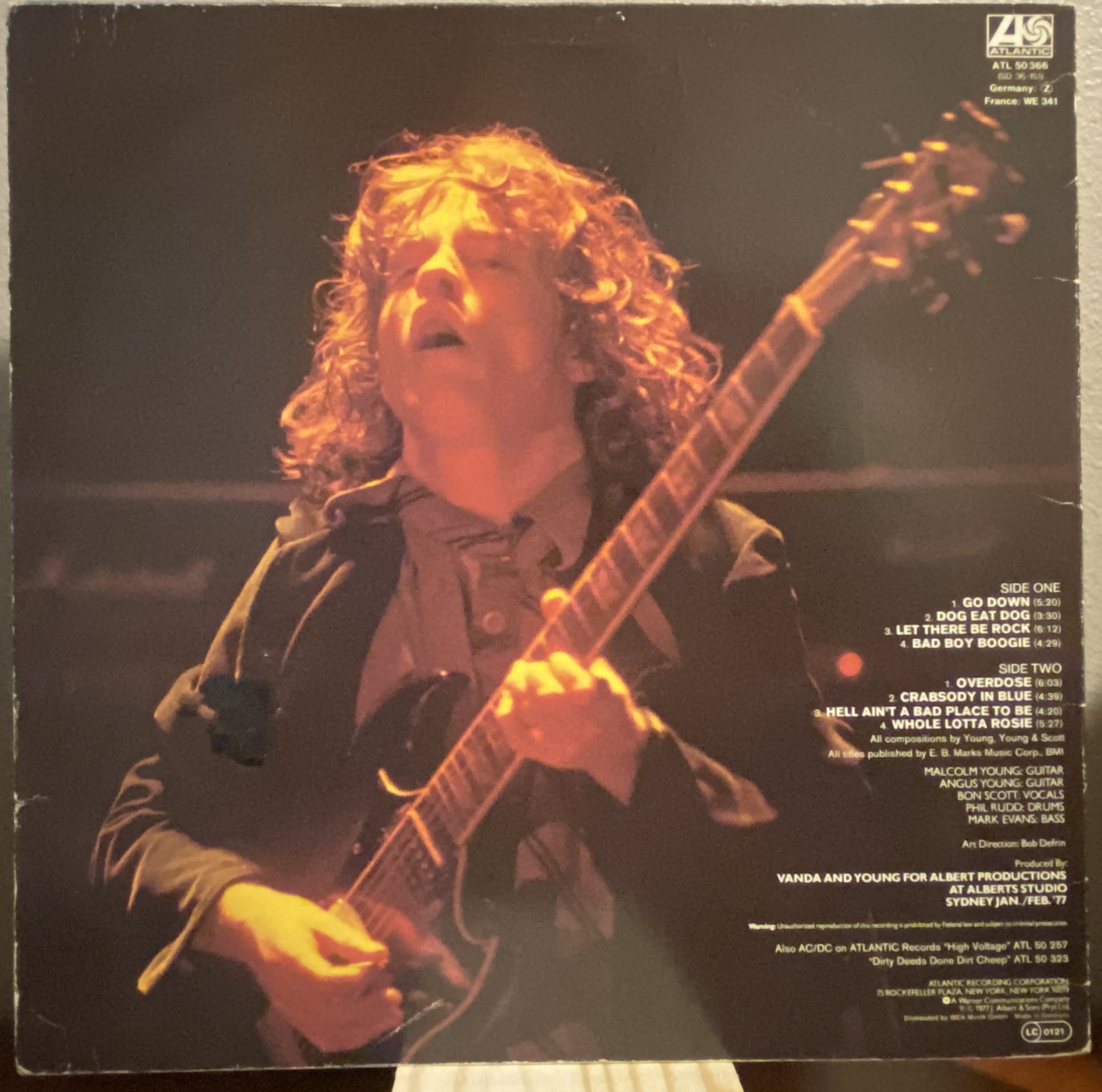 Side 1 1) Go Down 2) Dog Eat Dog 3) Let There Be Rock 4) Bad Boy Boogie Side 2 1) Overdose 2) Crabsody in Blue 3) Hell Ain't a Bad Place to Be 4) Whole Lotta Rosie |