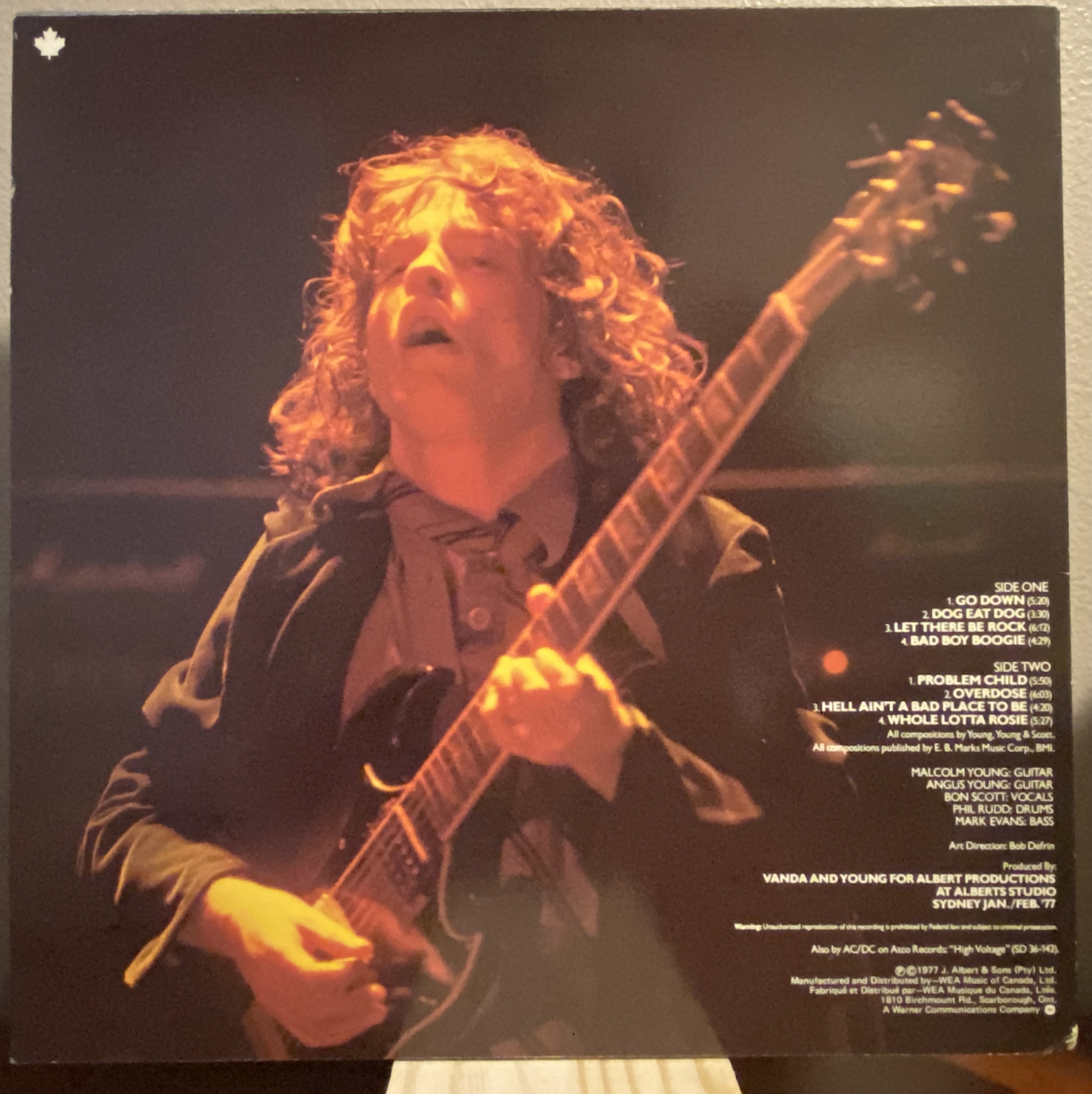 Side 1 1) Go Down 2) Dog Eat Dog 3) Let There Be Rock 4) Bad Boy Boogie Side 2 1) Problem Child 2) Overdose 3) Hell Ain't a Bad Place to Be 4) Whole Lotta Rosie |