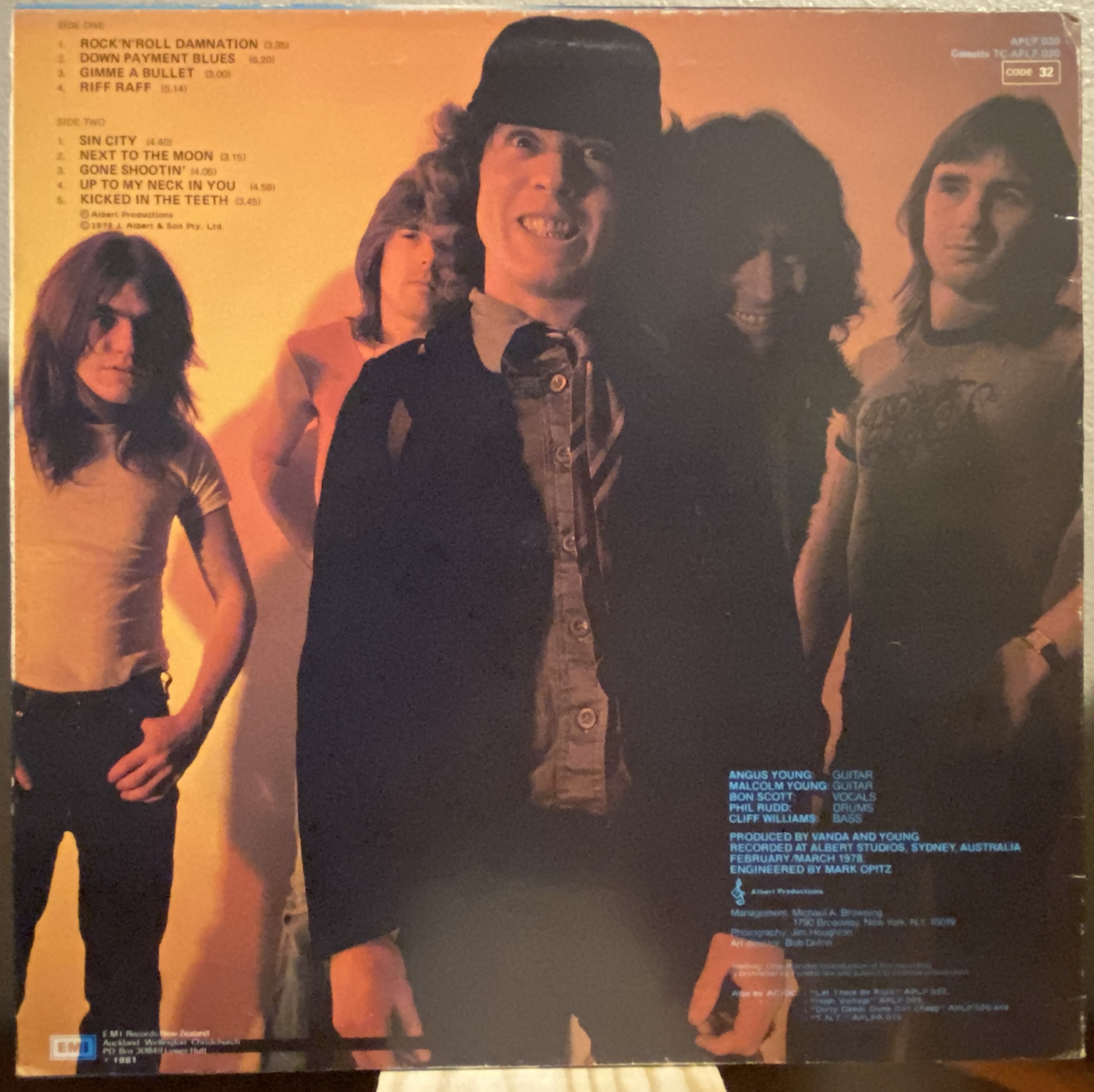 Side 1 1) Rock and Roll Damnation 2) Down Payment Blues 3) Gimme a Bullet 4) Riff Raff Side 2 1) Sin City 2) What's Next to the Moon 3) Gone Shootin 4) Up to My Neck in You 5) Kicked in the Teeth |