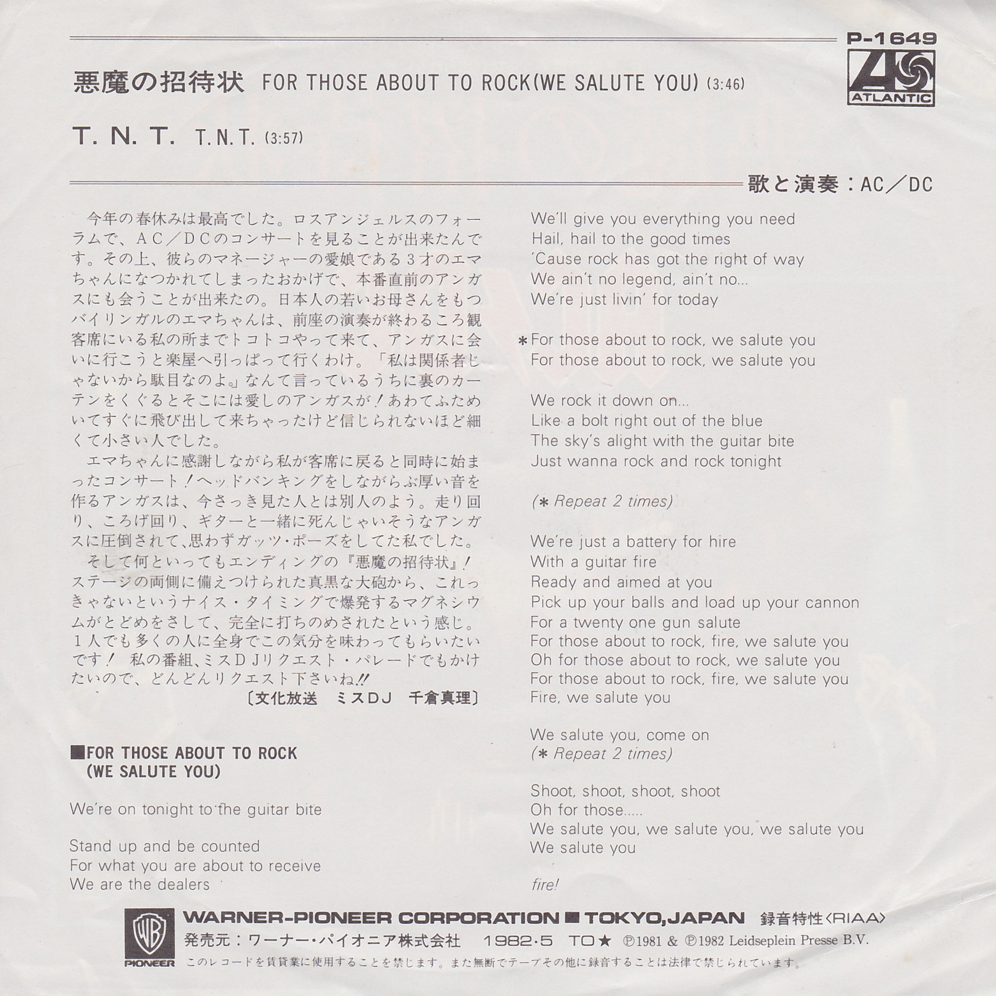 Side 1 1) For Those About to Rock Side 2 1) TNT |