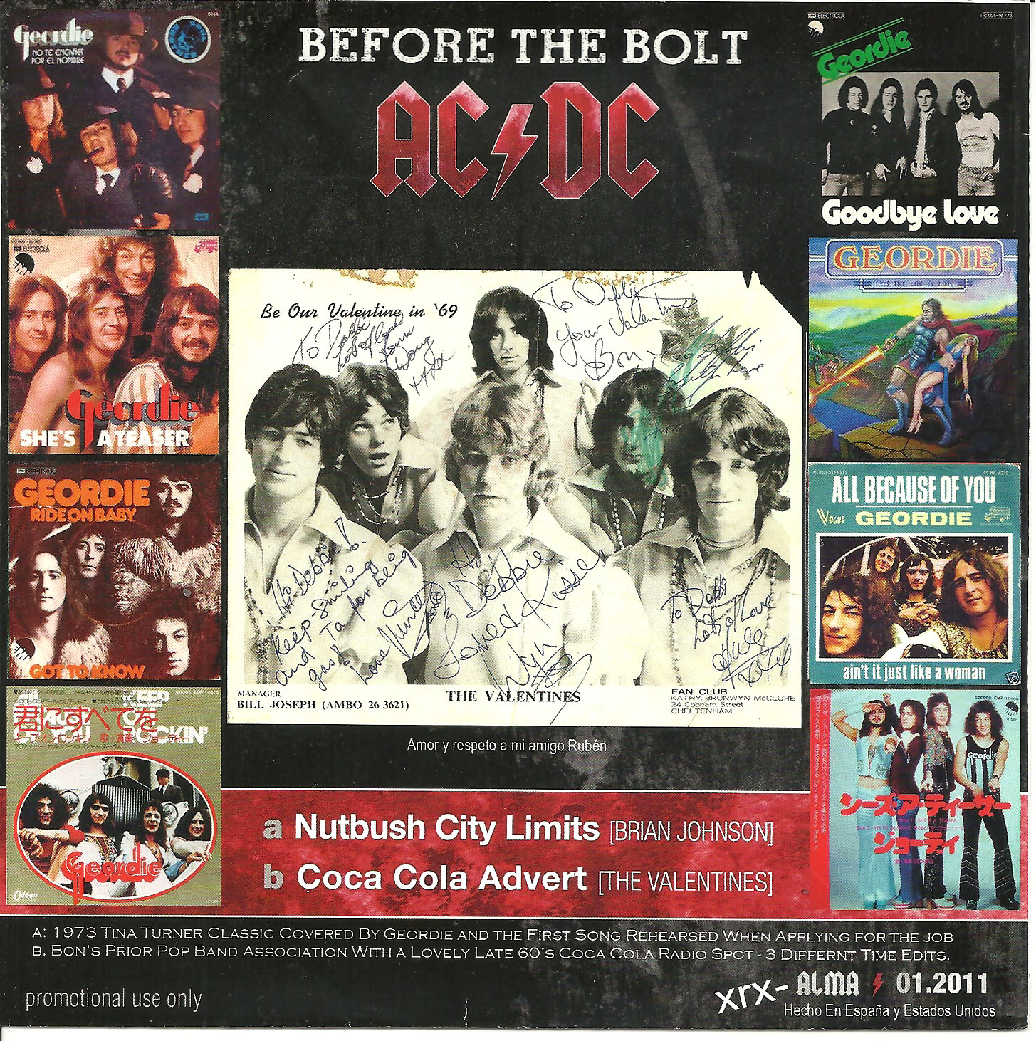Side 1 Track 1: 1973 Tina Turner classic covered by Geordie and the first song rehearsed when Brian applied for the job. Side 2 Track 1: Bon's prior pop band association with a lovely late 60's Coca Cola radio spot - 3 different time edits. |