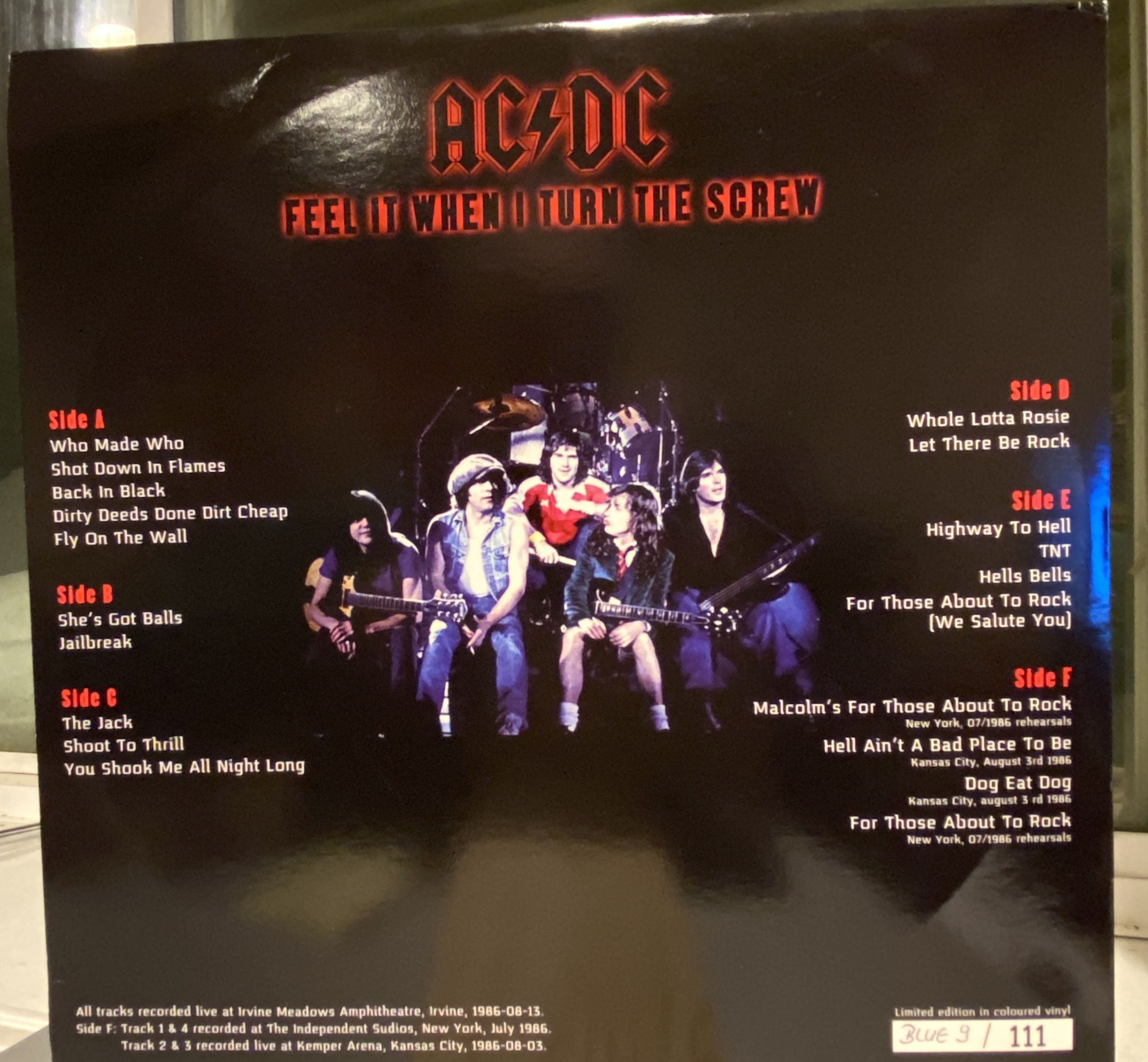 Side 1 1) Who Made Who 2) Shot Down in Flames 3) Back in Black 4) Dirty Deeds Done Dirt Cheap 5) Fly on the Wall Side 2 1) She's Got Balls 2) Jailbreak Side 3 1) The Jack 2) Shoot to Thrill 3) You Shook Me All Night Long Side 4 1) Whole Lotta Rosie 2) Let There Be Rock Side 5 1) Highway to Hell 2) TNT 3) Hells Bells 4) For Those About to Rock Side 6 1) For Those About to Rock (Malcolm) 2) Hell Ain't a Bad Place to Be 3) Dog Eat Dog 4) For Those About to Rock |
